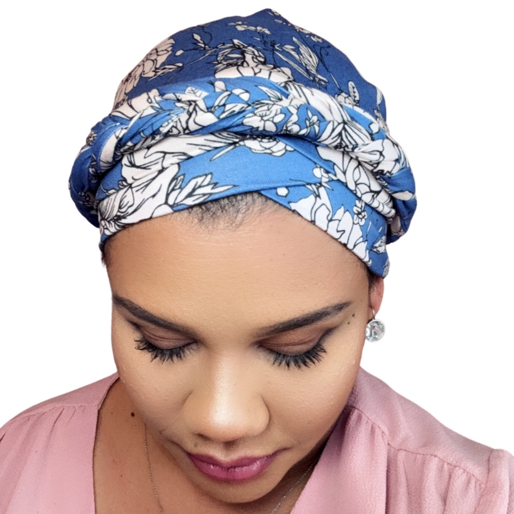 BLUE CREAM FLORAL Braid Satin-Lined Turban Pre-tied Headwrap